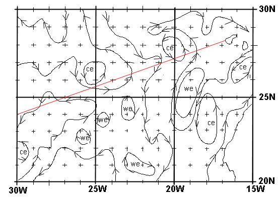 Canaries to about 24N 30W. The counterclockwise rotating cold eddy
